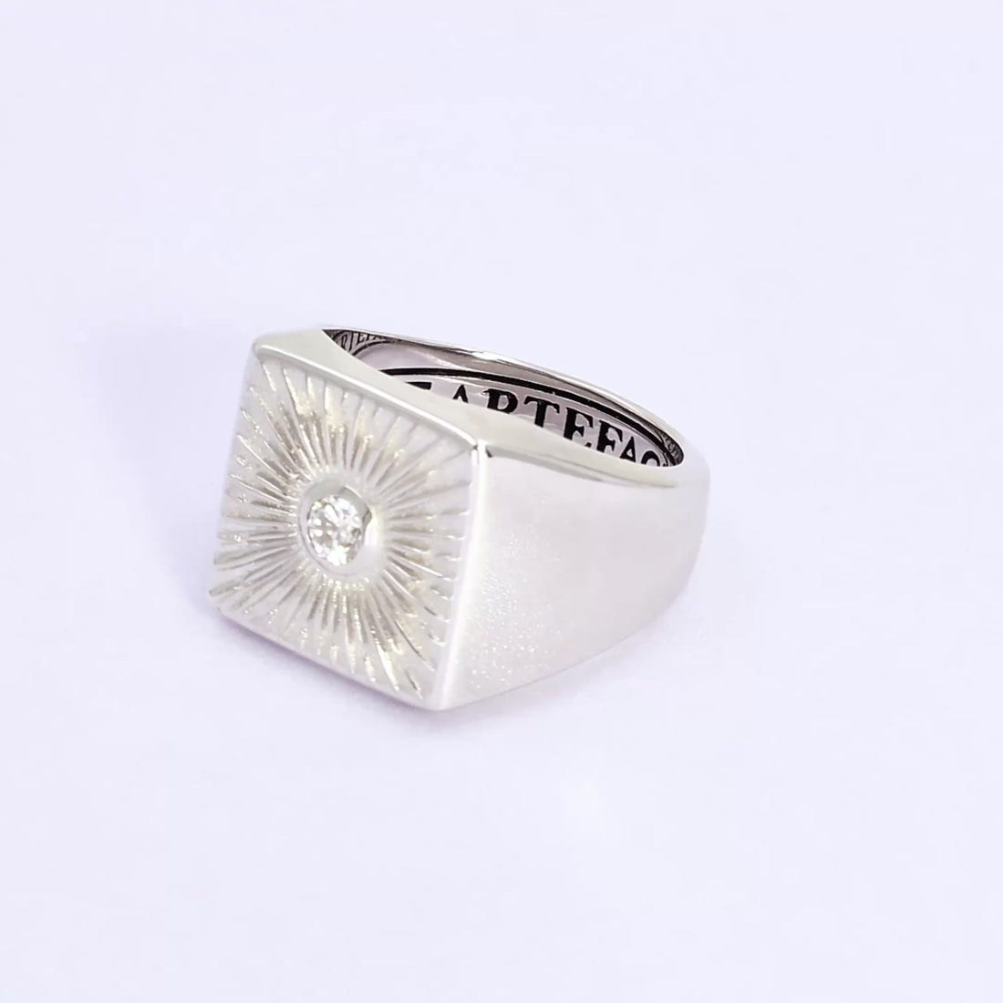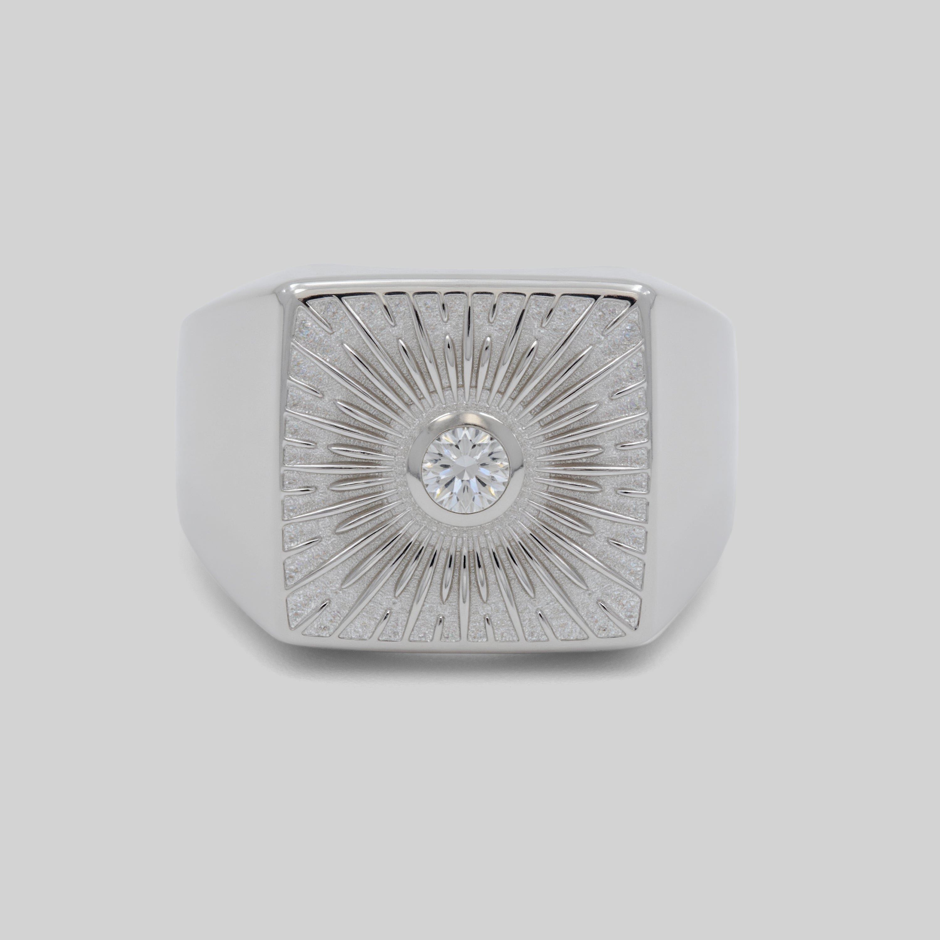 The Solar Signet Ring brings a modern architectural edge to the traditional signet silhouette. Crafted in solid sterling silver, the square face features a radiating engraved pattern that draws focus toward a centrally set lab-grown diamond. The detailing is precise, balanced, and clean—creating a subtle play of light across the surface without overwhelming the form.